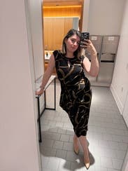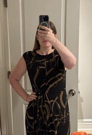 Got this new with tags on. Very flattering due to the side ruching and forgiving, stretchy fabric that hugs the right curves. Was great for a conference!
