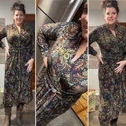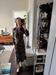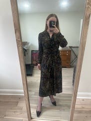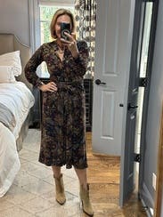 Loved this dress for Thanksgiving with the gorgeous fall colors. The fabric is super soft and drapes well. I’s overall a super flattering shape. Fits true to size.