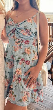 Cute dress! Wore this to a bridal shower and was very comfortable. The only thing is it might be a bit short for others. I’m petite / 5’0” and I was fine as long as I didn’t bend over but I could see this being a potential issue for taller people. Comfortable material and would consider renting again for a vacation somewhere warm.