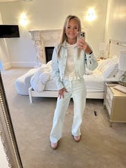 Absolutely loved this pant/jacket combo, can wear it dressed up or down for an everyday look with sneakers. The bow details are super cute!