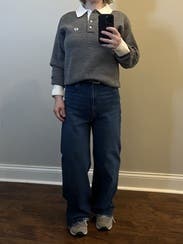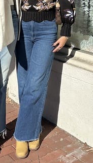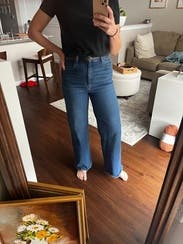 The problem with me and wide leg jeans is that I have a booty and a smaller waist and so they often hide my shape and I look frumpy. These are juuust a little tighter through the hips before turning into a true wide leg mid thigh. The result is perfect!! The length, the color, the shape, the raw hem detail, I really love these jeans and I’ll likely buy them. I wish there was just slightly less stretch (I like my jeans a bit stiffer) and there is a waist gap (normal for hourglass figures) but those don’t detract from everything that is great about these. My waist is 29-30” depending on the day and the size 28 for great for me.