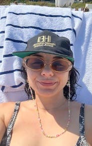 I have rented several of the le specs and they are my favorite sunglasses! Trendy shape without being too trendy- classic and flattering. These pink ones do not have very dark lenses so don’t do the most in the way of sun protection but they do make everything look California movie tinted. Sunglasses chain is my own :)
