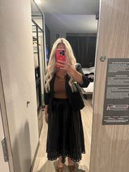 Probably the most comfortable leather skirt I’ve ever wore. Elastic waist so super comfortable and cute little details on bottom. Was heavier than I anticipated which made styling it a little more challenging, I felt way too bulky with a heavier top because the skirt was so full