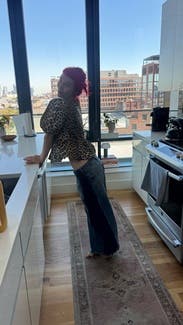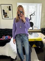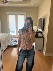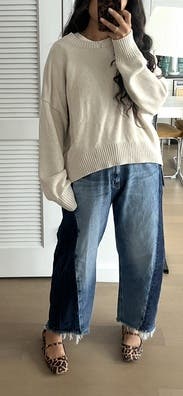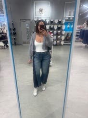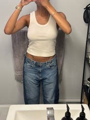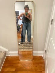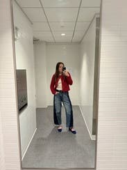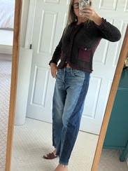Wore these low-waisted which I hadn’t seen in reviews — I loved! They’re definitely a bit bigger in terms of sizing, but they were fun. Also, the dark sides of the jean rubbed off a bit on my tote, so watch out for bleeding against light fabrics/furniture/etc.