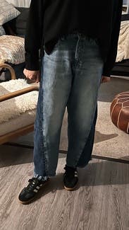 Relaxed, barrel jeans. Very cool detail with extra buttons on waistband that can cinch the fabric to make it tighter. Two-tone denim with darker panels on the side. These jeans manage to be classic and surprising at the same time. Got so many compliments, I decided I had to buy them.