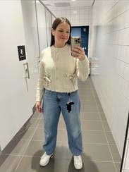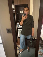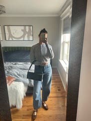 I really love the fit of these jeans—I probably should’ve gone down one size, but these jeans are still great. So comfortable and I love where they hit at the shoe.