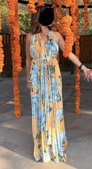 Wore this to a wedding after my original dress didn’t work out. This was so comfortable, flowy, and unique. I got compliments everywhere I went. Very forgiving as well. I wore the front as a deep V instead of a halter. I also crossed the waist strap for some additional back coverage due to my tan lines.