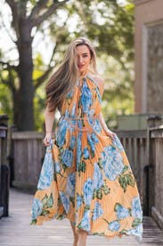 Orange floral (100% High Grade Pleated Polyester). Gown. Plunge Neck. Sleeveless. Tie closure. Shoulder to Hemline Length: 47.5". Imported.