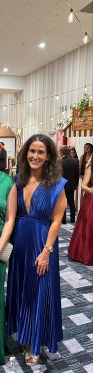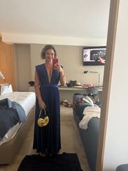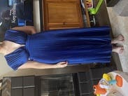 The color is stunning, even more beautiful in person. It came right out of the bag without a single wrinkle, ready to wear. I was 15 weeks pregnant and sized up for extra room, which worked perfectly. The waistband hit at just the right spot for my bump, offering plenty of space and comfort without feeling tight, especially great for taller frames. The only downside was the extra fabric on the shoulders; it looked elegant, but felt a bit awkward, and I didn’t trust the fashion tape to hold during a night of dancing. If you’re not planning on a lot of movement, though, this gown would be a perfect choice.