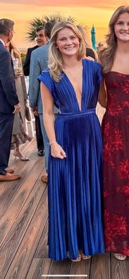 Meet the L’IDÉE Deep Azure Gala Gown—a bold splash of cobalt in a striking pleated silhouette that brings energy to any summer evening. Style it with metallic sandals and a sleek clutch for a statement-making warm-weather look.