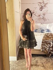 Wore this to a winter cocktail reception- loved the metallic shimmer and flounce hem. Ran a bit short for a tall girl but I wore it with tights and it ended up being fine paired with heels. Neck button closure is a bit tight but not unbearable. Ended up being a great unique option for a western reception especially paired with turquoise and a fur jacket.