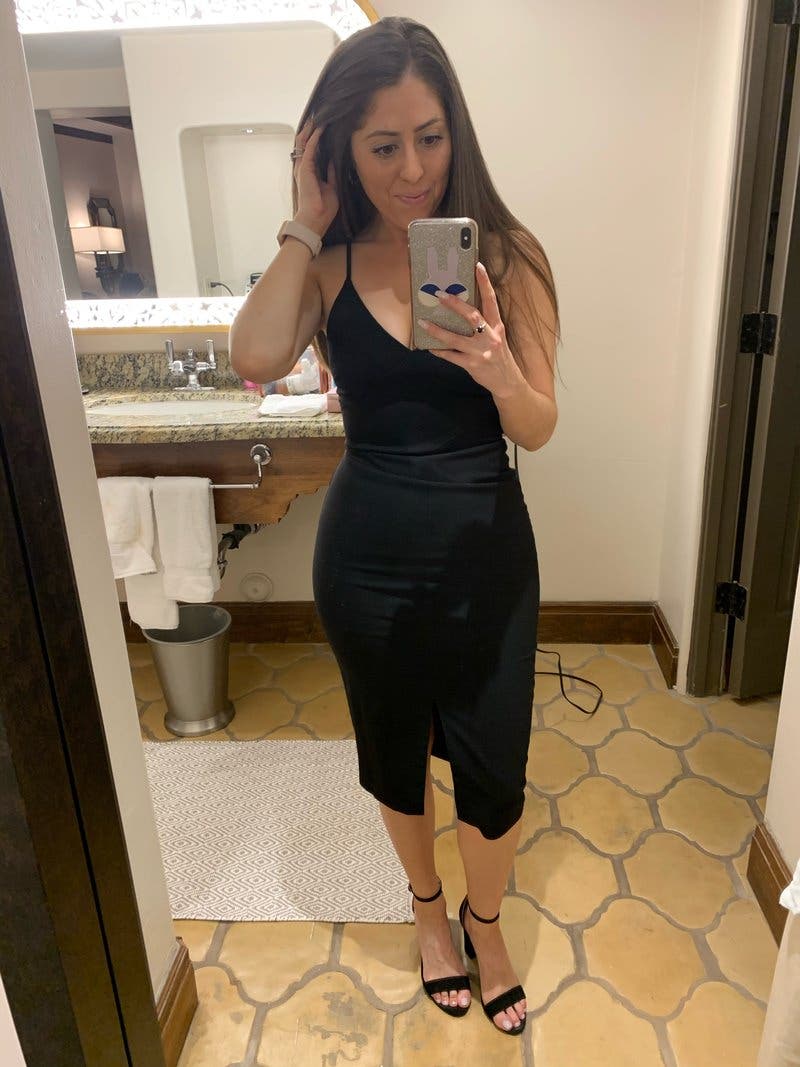 Black crepe (67% Polyester, 27% Rayon, 6% Spandex). Sheath. Sleeveless. V-neckline. Hidden back zipper with hook-and-eye closure. Partially lined. 42" from shoulder to hemline. 33" from shoulder to top of slit; 9" Slit. Imported.