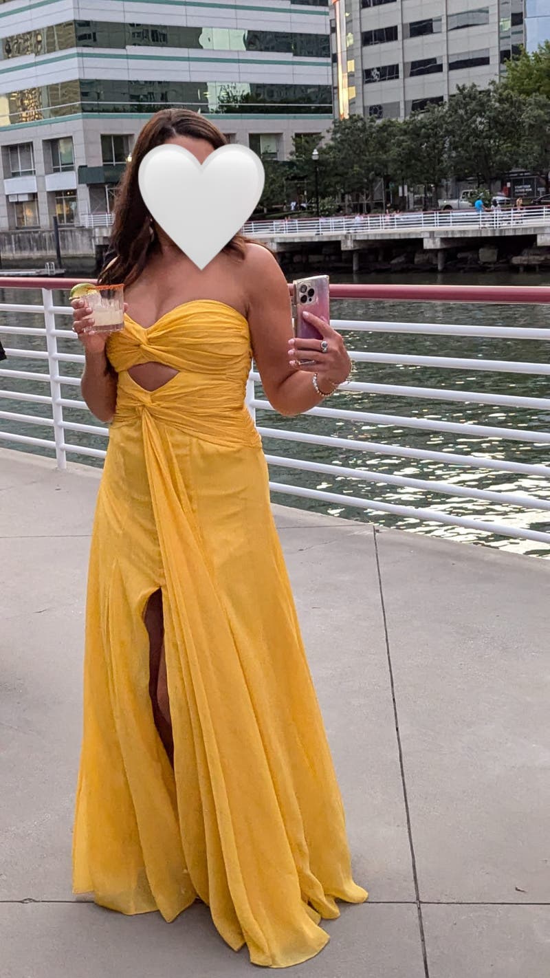 This flowy sunflower yellow gown by LIKELY is giving peak Grecian vibes with an effortless thigh-high slit and chest cutout.