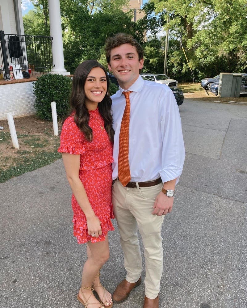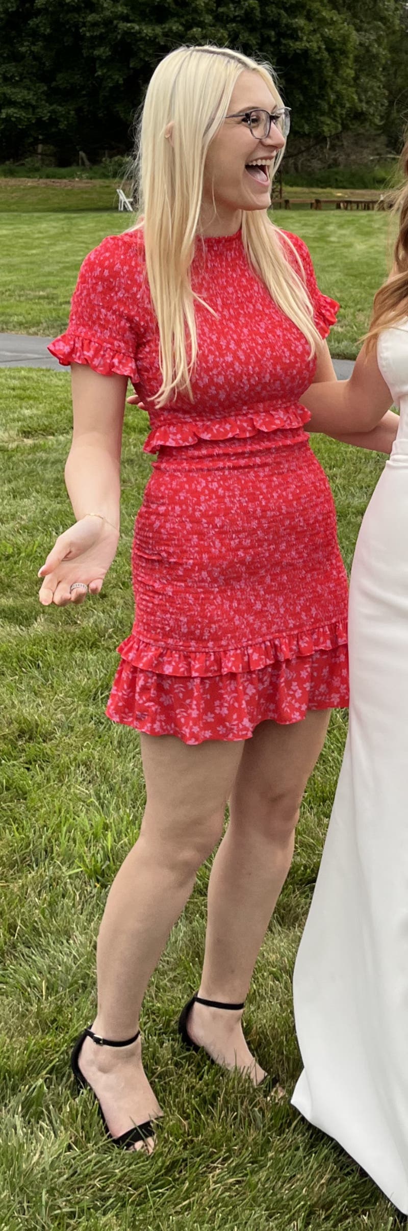 Red floral printed crepe (100% Polyester). Sheath. Short sleeves. Crew neckline. Center back zipper with hook-and-eye closure. 35" from shoulder to hemline. Imported.
