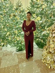 The material is very thick and nice and warm. The slit is very high. I typically hover between a 4 and a 6 and most of the reviews told me to size up so I expected to wear the 6 but I wore the 4. The shoulders are really snug and the arms are pretty loose which was an odd combo. Overall, the dress was well liked. Giving it a 4 star instead of a 5 simply because the shoulders/arms were a little oddly sized. The dress does have shoulder pads which I ended up liking.