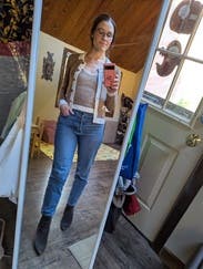 Love that this is a 2-in-1 set! I mainly wore it buttoned up while on vacation in Scotland, but it also looks great unbuttoned, sweater only, or just the cami. I’m 5’3” with a long torso and I found it hit just at the right spot of my jeans.