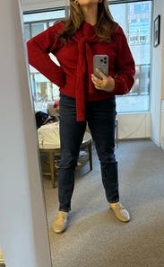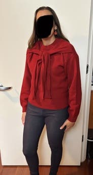 For me the sweater is too short length-wise and too loose on my torso. The tie thing in the front is both cute and weird at the same time. Wearable but not my fav.
