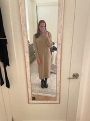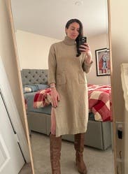 Never wonder what to wear again when you don this easy sweater dress by Line + Dot with bold gold jewelry and suede boots.