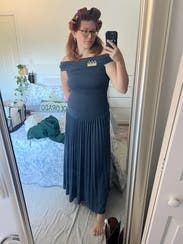 This dress is super comfy and great for any event with your baby bump. I got loads of compliments. The only thing that was a little annoying with the dress was the off-the-shoulder top part riding up every now and then, but otherwise the length and fit were great.