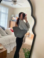 I really like this tote, but I think I would prefer the larger size in general. This one is big enough to fit my wallet, a book, and everyday essentials, but I prefer just a little more room in a tote. The straps feel really sturdy. I did get one with little scratches all over, but it's not super noticeable.