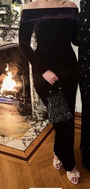 Gala wristlet bag. Black kaleidoscope velvet. Multi-color hand-sewn acrylic beads and black belt top handle. Drawstring closure. 9" H x 7.5" L x 1" W.