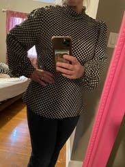 A real beauty of a blouse. Loved the little puffed shoulders that have some life. Love the fabric and the pattern with polka dots and cream. This combo was clutch. Fit was great.