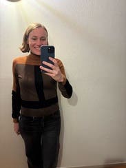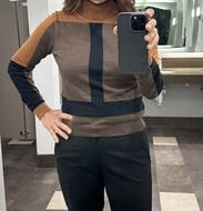 Loved the fall colors and color blocking! Good transitional fall weight, appreciated that it was not heavy at all. Didn’t find it itchy. Could have gone with a M.
