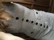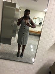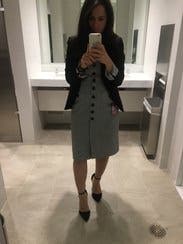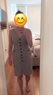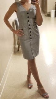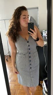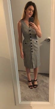 Adored this dress. Good work length, buttons in flattering shape, stretchy fabric, it was awesome. This angle makes the chest look a little revealing but it's just the weird way I'm holding the phone. Would rent again.