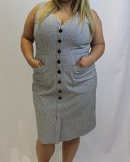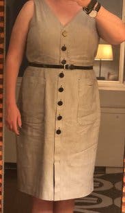 A nice simple dress with a good weight. Pockets are functional. Funky buttons (although I was worried they would fall off). Fit well, but the arm holes were small for me. Overall nice dress.
