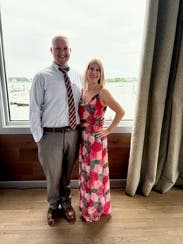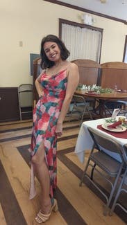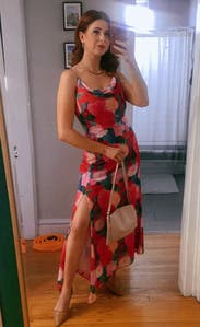 This dress was so fun and the colors were gorgeous! The slit isn't too high and the top isn't too revealing! Loved it!