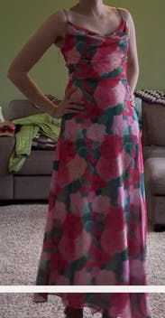 I absolutely loved this style - the cowl neck was so flattering and the handkerchief bottom added a fun element. The pattern was super bright and cheerful for a late summer wedding! Lots of compliments. I sized up to a S for more room around the waist.