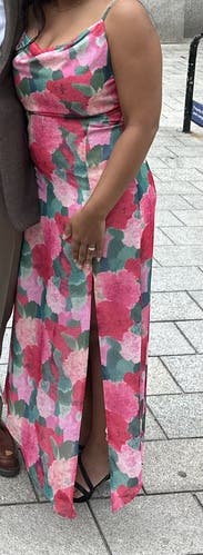 Perfect dress for a summer garden wedding. It is longer in the back, I’m 5’6 and was perfect with heels. Received lots of compliments. I am a 32D and even without a bra the dress offered support and the bust fit perfectly. Adjustable straps allows you to show less or more cleavage. Very flowy fabric and bright colors that stood out. Loved it!