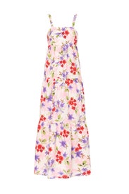 Purple floral cotton blend (97% Cotton, 3% Spandex). Maxi. Square neck. Sleeveless. Pull-on. 57.5" from shoulder to hemline. Imported.