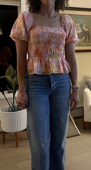 This top fits true to size and is super stretchy. You can wear the sleeves on your shoulders, as I have in my photo, or off your shoulders, for a flirty look. The colors are fun and vibrant. Would recommend!