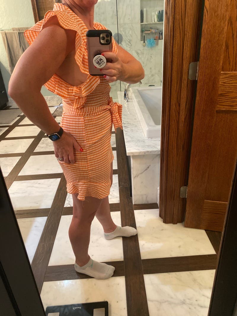 Flutter sleeves look positively perfect draped in orange gingham in this flirty weekend romper by Louna.