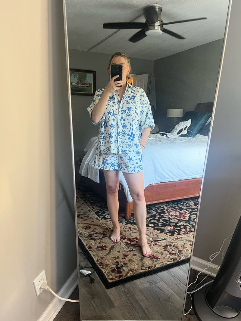 Blue printed polyester blend (80% Polyester, 15% Rayon, 5% Spandex). Top. Collared. Short sleeves. Front button closure. 24.5" from shoulder to hemline. Imported.