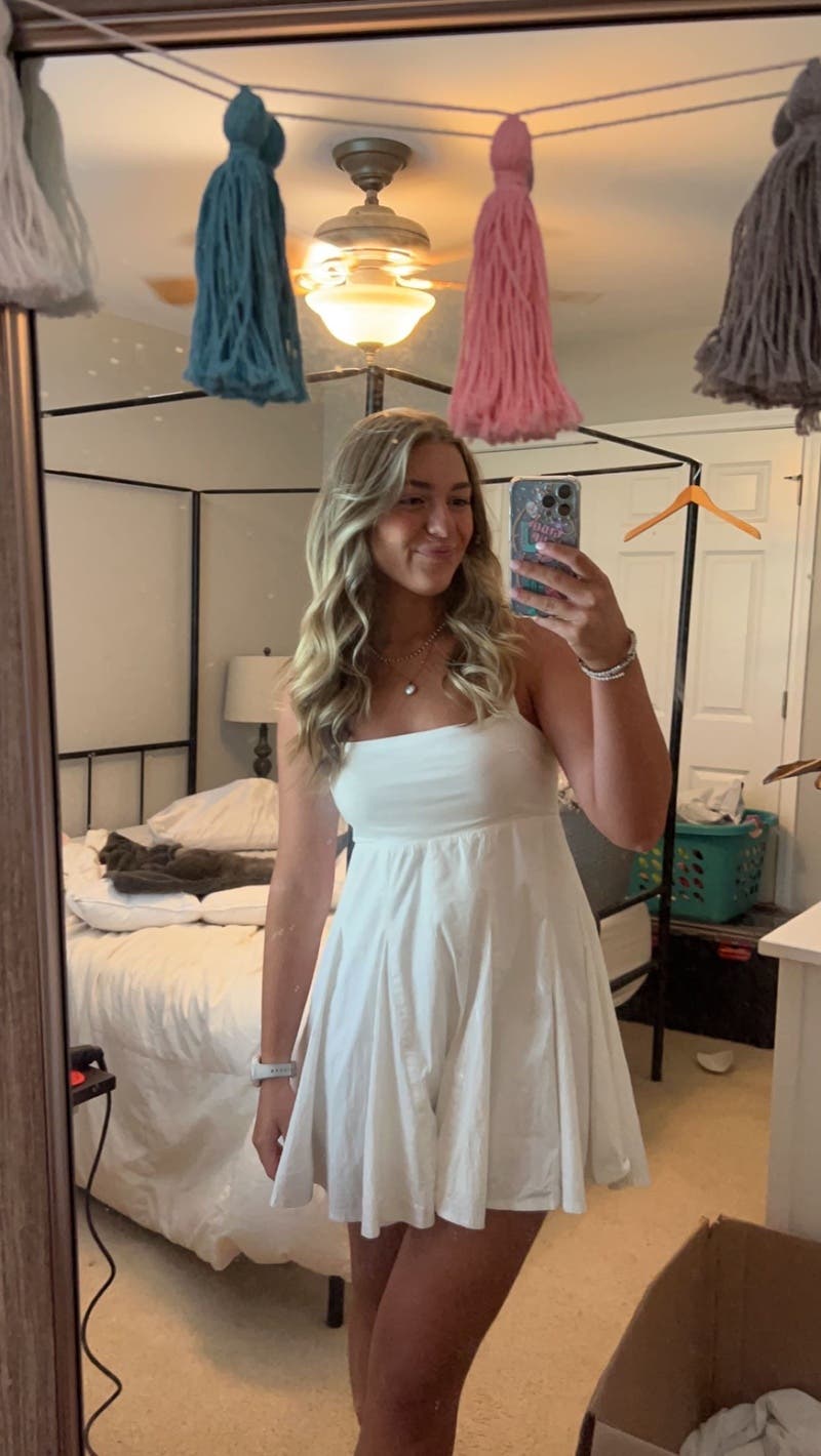 White cotton blend (97% Cotton, 3% Spandex). Lining (100% Rayon). Square neck. Sleeveless. Tie closure. 2" inseam. 30" leg opening. Imported.