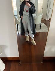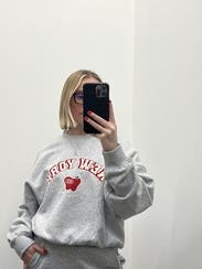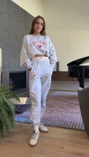 Cute sweatshirt, but it only really works with the matching pants. Fit is TTS but long; I tucked it to show the double waistband matching pants. Lightweight and not too warm. Big downside: after one wear, the letters and apple graphic started cracking and peeling. Super disappointing because I wanted to buy it. I may have just gotten a lemon and RTR took care of me! Photo is a grainy still from a video.