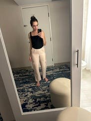 I liked the pants. When I first put them on the button popped off. They are tight in the waist. I like them when I’m standing up, but probably couldn’t wear them all day sitting. I also liked the soft silky feel of them. I rented the yellow top but did not wear the yellow top with them. I wore a black top.