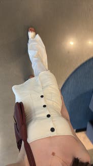 Beautiful white pants. Absolutely LOVE the cut. wish it has a liner. as other review said, it sees through!!! Made it worked with a long top :) tight waist, size up!