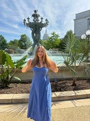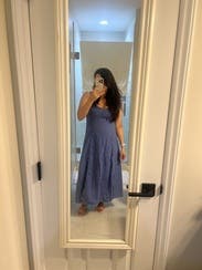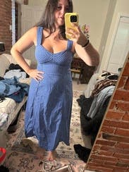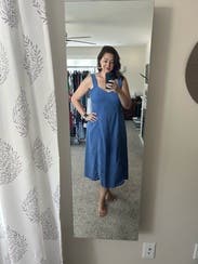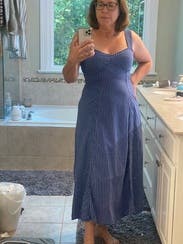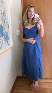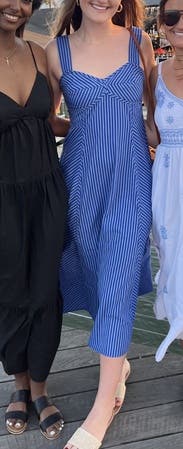 I love this dress. It fits great and feels good on. I can wear a bra because of the straps although it did show now and then and I’d have to readjust. I love the color and the stripes. I probably could have ironed the bottom after it being in the bag, but it wasn’t totally necessary. I would rent again or buy.