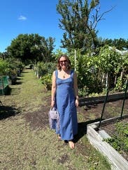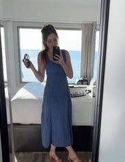 This breezy blue and white striped midi dress from Madewell offers a relaxed, summery vibe. Accentuate its casual charm with simple sandals and a woven tote bag.