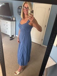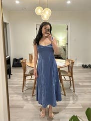 Loved this dress- got so many compliments on the color and style of it! I loved the cut of the top, it felt very flattering to wear. The material was light and breezy which was nice in the summer!! It fit perfectly!