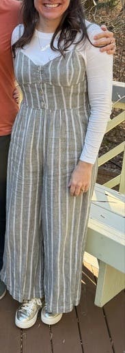 Type: Hate wearing bras, small chested; curvy bottom. Mom belly. Pros: 1. adjustable straps. 2. Didn’t have to wear bra. 3. Vertical stripes and wide legs are flattering. Cons: doesn’t pack well and wrinkles fast. I’m 5’5” so it hit right above my ankles. I wore this for day-touring in Europe and for West Coast Swing dancing! It was so comfortable but of course not super breathable for sweating but i danced in it all night. I also styled it for the office with a blazer and work heels. It’s so versatile. I think i could’ve sized down because of the gauze backing that allows for stretching. I’m small chested too. If the size down 4 fits well, I’ll probably buy it. You must rent this fun jumpsuit!