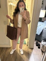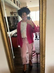 Wore these for valentines work event. So easy to style and casual enough to wear with sneakers.
