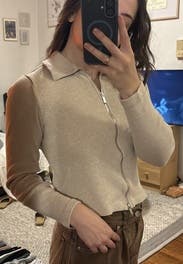 Perfect way to go from day to dangerous by just zipping it up (or down). It's a simple top on the thinner side (It's not very warm) but great to go from a more conservative smart casual to a little more low cut and peak of skin.