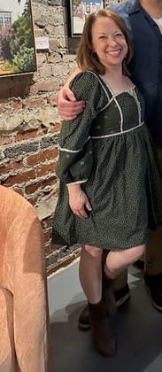 I got so many complements on this dress. The color is a flattering forest green and the print is adorable. It is a little on the shorter side for me, but not inappropriate.