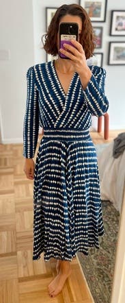 I adore this brand, but I was disappointed by this dress, which appeared to be wearing me instead of vice versa. I have a relatively small waist, but it looked wide in this dress. I did not wear it.