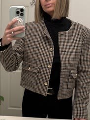 Perfect fit and plaid! Wore many times with jeans and with black pants to be dressier for meetings. Almost purchased!
