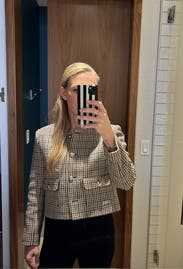 I wore this to an interview and to my office a few times and LOVED it. It’s cropped but not too short, and not having a collar makes it different which I really liked. It’s super warm, so keep that in mind with whatever you layer underneath. I had a black long sleeve bodysuit on under the jacket and was toasty, next time will wear a sleeveless one.